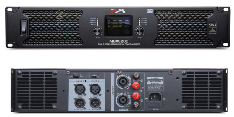 پاور آمپلی فایر قدرتمند RS مدل MGX8200 یک پاور هوشمند در کلاس H می باشد و می تواند نهایتا ۸ اسپیکر ۸ اهم را با تمام توان تامین کند . خروجی این پاور هوشمند بوده و بر مبنای میزان ورودی اسپیکر توان امپلی فایر تغییر می کند ، اتصال کوتاه و کمپرسور صوتی برخی از قابلیت های این پاور اسمارت می باشد . صفحه نمایش دیجیتال میزان دسیبل ورودی صدا و میزان حرارت پاور را بر حسب درجه سانتی گراد به نمایش می گذارد . امکان بریدج کردن پاور در این دستگاه وجود دارد و می توانید با تغییر سلکتور GAIN مسافت های طولانی کابل را پشتیبانی کنید .